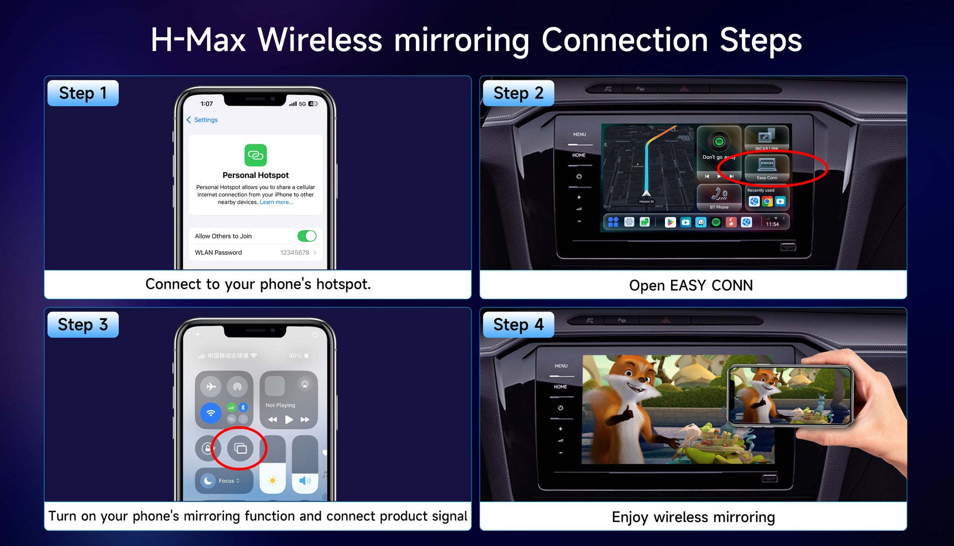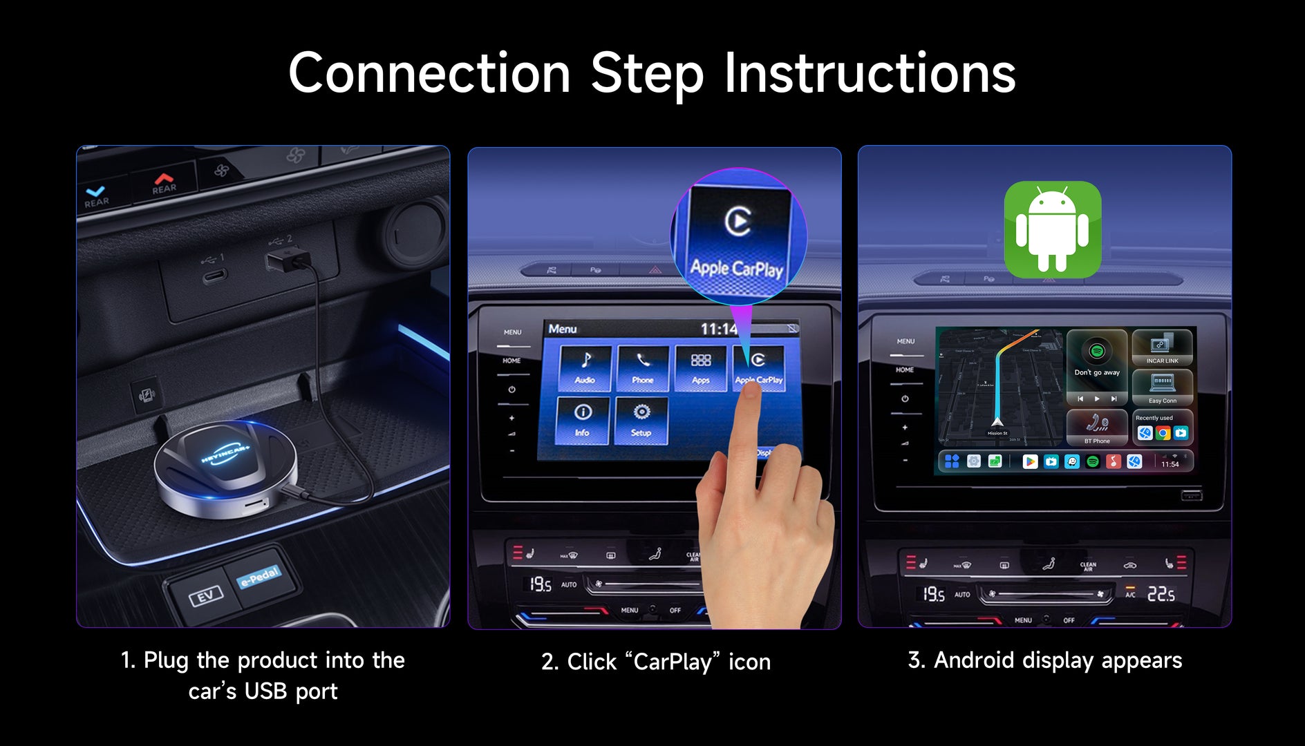 Plug & Play Installation: Easy setup with no complicated wiring. Simply plug the device into your car’s USB port and enjoy the wireless CarPlay/Android Auto experience. No need for professional installation or modifications to your car's stereo system.
