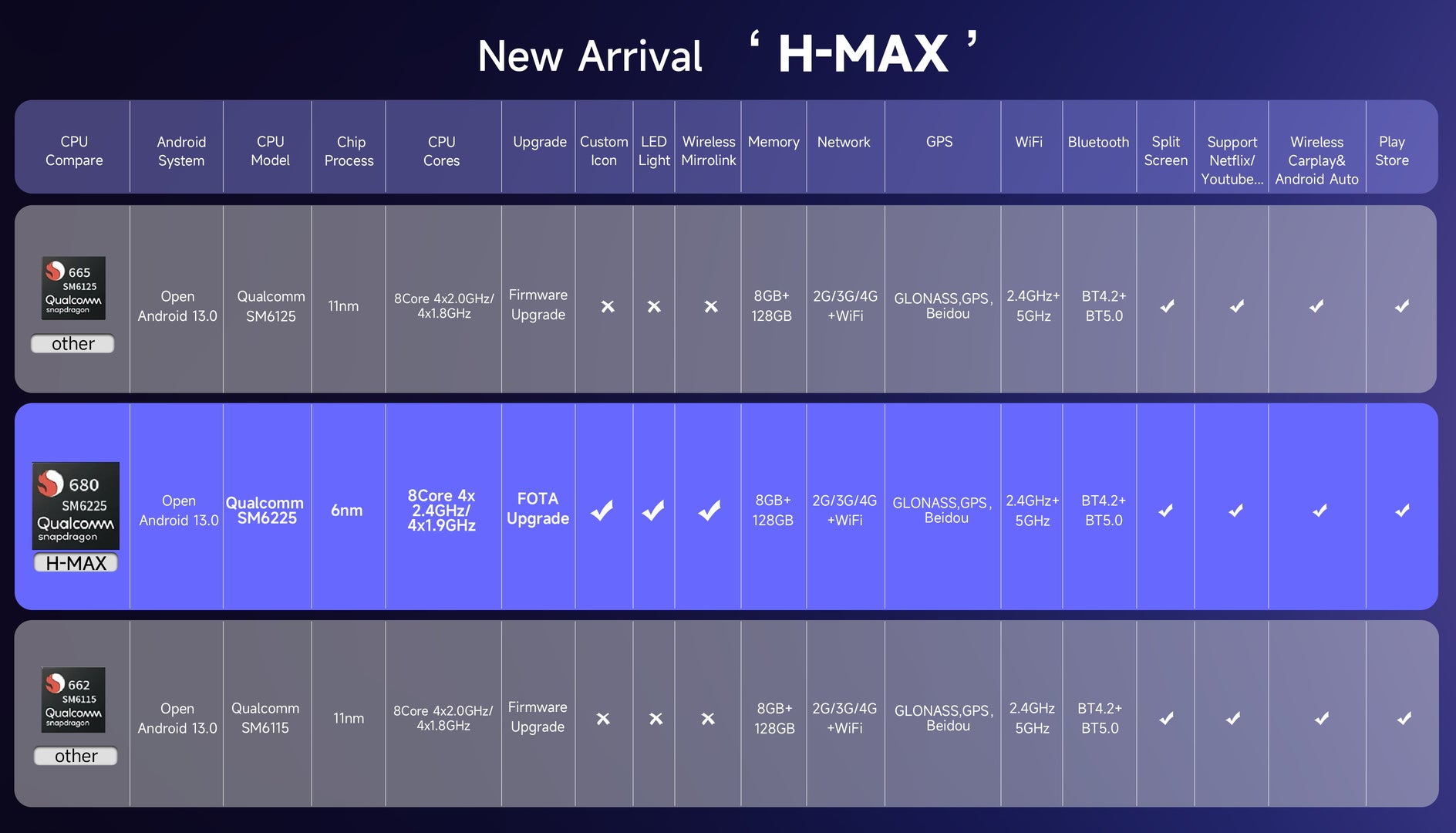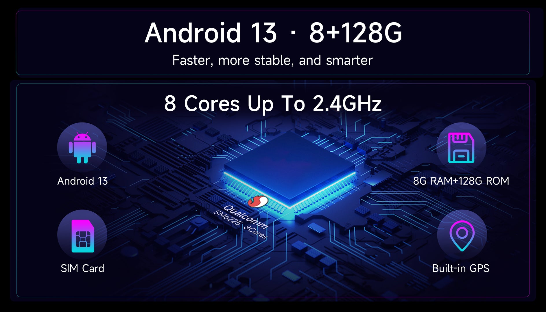Android 13.0 System: Powered by the latest Android 13.0 OS, enjoy a responsive, fast interface with access to popular apps like Netflix, YouTube, Spotify, and many more directly from your car's screen.